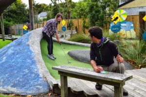 Hidden behind the Gisborne i-SITE, beyond all the flyers and local information, is a pretty awesome mini golf course. It’s a super cheap thing to do if you need a fun way to pass the time in Gisborne! Armed with a golf club and a ball, we go through the back of the i-SITE to the 18-hole golf course which is so pleasingly Gisborne! Each hole has a some sort of Gisborne or east coast theme: it has surfing, fishing, 4-wheel driving, fishing, the East Cape Lighthouse, our favourite: freedom camping, and so much more. We never thought we would say this but this is a golf course with an awesome sense of humour!