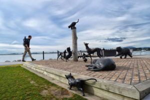 After some breakfast and a bit of a work session at the Harbourside City Backpackers, we roll out onto the waterfront of Tauranga known as ‘The Strand’. It’s right on the hostel’s doorstep! So we take a stroll along The Strand passing all sorts of weird and wonderful sculptures and water features. Our destination is over the bridge to the suburb of Mt Maunganui Beach so that we can check out Moturiki, a.k.a. Leisure Island. It doesn’t really make a lick of sense considering we were staying over in Mt Maunganui for an entire week, but only now have we found the time visit Moturiki. We have our car parked at the end of The Strand, so we hop in for the 10-minute drive to the beach.