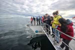 As we pick up speed, the boat attracts more nearby dolphins who surf the wake behind the boat, as well as right underneath the bow of the boat. They are so close we can see their eyes and even hear them! We can’t take our eyes off them, until Andy comes on the microphone again to say there’s a whale up ahead!