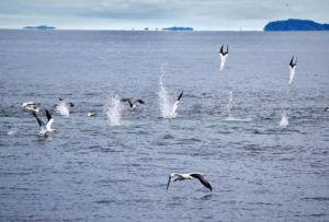 Andy tells us to keep an eye on the middle of the gannet group diving to get fish. Suddenly, the huge underside of the whale’s mouth emerges from the water with fish leaping out with it in a desperate attempt to escape. The boat goes silent in disbelief, then general: “Wow”s and “That was awesome”s…