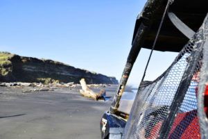 Warrick put the foot down and we are flying! Potholes mean nothing to this vehicle! We are hurtling towards the beach with an awesome view of the Wanganui River on one side. Where there is a corner to cut, Warrick takes it, even if it is a short drop down the side of the gravel road.