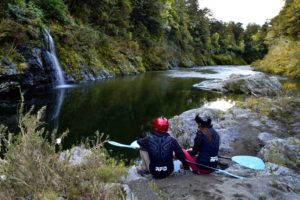 Around another corner, we land on the stony banks for a classic game of skimmers. We even challenge ourselves to kayaking as much as we can upstream to underneath a swing bridge. Although we are weak as sh*t and don’t make it very far compared to our guides, we do enjoy a few more small waterfalls gently tricking down the mossy rocks.