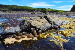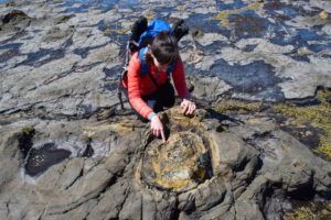 Nevertheless, Curio Bay is a marvel in itself. From the platforms above we can see distinct outlines in the rock pools below of fallen tree trunks. We head down the steps and onto the rock pools for a closer look.