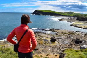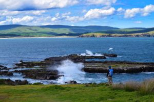 As expected, the ice creams are delicious. Now we have the energy to do a one-minute climb up to a viewpoint looking over both Curio Bay and Porpoise Bay. While Laura is lapping up the views of Curio Bay from above, Robin is looking over at the rocks protecting Porpoise Bay from the swells coming in. Huge waves crash against the rock, trying to bring down any kelp that clings to the rock faces. It’s fierce, but nowhere near as fierce as the waves we have seen on the West Coast of the South Island. (Seriously, check out our blog post: From Snow to Blowholes: On the Road in the Wild West Coast).